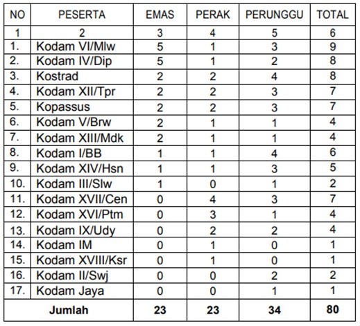 Untuk pertandingan Sepak Bola babak penyisihan : Pukul 13.30 bertempat di Stadion Sapta Marga : dipertandingkan antara PS Kodam XVIII/Ksr Vs PS Kostrad skor 4-1 untuk Kostrad dan di Stadion Gemilang dipertandingkan antara PS Kodam XVI/Ptm Vs PS Kodam XII/Tpr skor 0-0. Pada pukul 15.30 bertempat di Stadion Sapta Marga dipertandingkan antara PS Kodam I/BB Vs PS Kopassus, skor 0-0, di Stadion Gemilang antara PS Kodam III/Slw Vs PS Kodam IM, skor 4-0 dimenangkan PS Kodam IM. Pada pukul 08.00 dilaksanakan pertandingan Tenis Lapangan babak 8 (delapan) besar bertempat di Lapangan Tenis Akmil dan Lapangan Tenis New Armada Magelang. Untuk Partai Ganda Pamen 45 tahun ke atas dipertandingkan antara Kodam IV/Dip Vs Kodam III/Slw, skor 67(4) – 06, antara Kodam IM Vs Kodam I/BB, skor 57(7) – 76(5), Kodam II/Swj Vs Kodam IX/Udy, skor 64 – 63, Kodam XIV/Hsn Vs Kodam Jaya, skor 62 – 60.