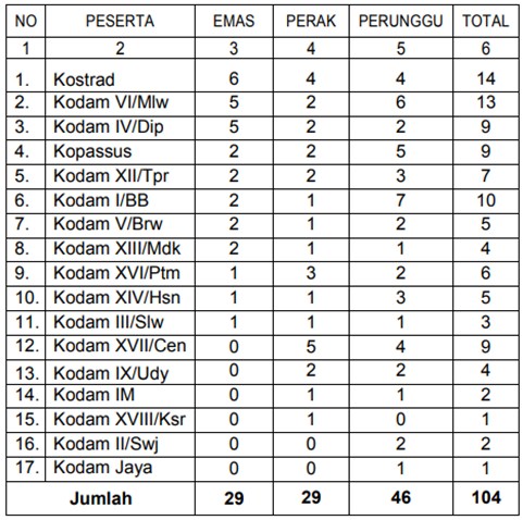 Masih pada pertandingan Tenis Lapangan : Partai Ganda Pamen 45 tahun ke bawah dipertandingkan antara Kodam IV/Dip Vs Kodam V/Brw, skor 46 – 67(1), Kodam IX/Udy Vs Kodam VI/Mlw, skor 62 – 62, Kodam II/Swj Vs Kostrad, skor 36 – 67(4), Kodam XVII/ Cen Vs Kodam XVI/Ptm, skor 61 – 16(3). Untuk Partai Ganda Pama dipertandingkan antara Kodam XII/Tpr Vs Kodam V/Brw, skor 63 – 63, Kodam XVII/Ksr Vs Kopassus, skor 36 – 46, Kodam VI/Mlw Vs Kostrad, skor 62 – 60, Kodam III/Slw Vs Kodam IV/Dip, skor 62 – 57(8). Partai Tunggal Pama dipertandingkan antara Kodam XVI/Ptm Vs Kodam XVII/Cen, skor 36 – 06, Kodam IX/Udy Vs Kopassus,skor 61 – 61, Kodam I/BB Vs Kostrad, skor 76(5) – 62, Kodam III/Slw Vs Kodam Jaya,skor 60 – 60. Di Partai Ganda BA/TA/PNS dipertandingkan antara Kodam Jaya Vs Kodam XVII/Cen, skor 63 – 64, Kodam IX/Udy Vs Kodam II/Swj, skor 76(3) – 60, Kodam VI/Mlw Vs Kostrad, skor 06 – 57, Kodam XIVI/Hsn Vs Kodam XII/Tpr, skor 62 – 63. Partai Ganda Putri dipertandingan antara Kodam IV/Dip Vs Kodam V/Brw, skor 64 – 76(3), Kodam IM Vs Kodam I/BB, skor 06 – 26, Kodam II/Swj Vs Kodam IX/Udy, skor 60 – 60, Kodam III/Slw Vs Kodam XII/Tpr, skor 46 – 64(10). Partai Tunggal Putri dipertandingan antara Kodam IV/Dip Vs Kodam V/Brw, skor 76(6) – 36(5), Kodam IM Vs Kodam VI/Mlw, skor 61 – 60, Kopassus Vs Kodam IX/Udy, skor 62 – 64, Kodam III/Slw Vs Kodam XIII/Mdk skor 62 – 62. Sementara itu, pada pukul 13.11 s.d. 14.25 dilaksanakan pertandingan Tinju babak final bertempat di GOR Sudarto Akmil Kelas 52 kg yang menang adalah Prada M Fahmi Ikhsan dari Kostrad sebagai juara I memperoleh Medali Emas, Pratu Dudu Surya M dari Kodam III/Slw sebagai juara II meraih Medali Perak, Pratu Pengharapan W dari Kodam I/BB dan Pratu Samsudin dari Kodam VI/Mlw masing-masing sebagai juara III meraih Medali Perunggu. Sedangkan untuk Kelas 56 kg yang menang adalah Praka Jems Steverson dari Kodam XVI/Ptm sebagai juara I meraih Medali Emas, Prada Ardi Wibowo dari Kostrad sebagai juara II meraih Medali Perak, Pratu Deniwan Saputra dari Kodam IM dan Pratu Kalam Nawawi dari Kodam V/Brw masing-masing sebagai juara III meraih Medali Perunggu. Untuk Kelas 60 kg yang menang adalah : Prada M Idris dari Kostrad sebagai juara I meraih Medali Emas, Sertu Heryer Jeet TP dari Kodam XVII/Cen sebagai juaran II meraih Medali Perak dan Praka Anto Hutajulu dari Kodam I/BB serta Pratu Chresno Biondy dari Kodam XVI/Ptm masing-masing sebagai juara III meraih Medali Perunggu. Kelas 64 kg yang menang adalah Prada Daniel Mofu dari Kostrad sebagai juara I meraih Medali Emas, Sertu Gusti Sidhasana dari Kodam VI/Mlw sebagai juara II meraih Medali Perak dan Prada Rocky Andri Y dari Kodam XVII/Cen serta Praka Jalaludin dari Kodam I/BB masing-masing sebagai juara III meraih Medali Perunggu. Kelas 69 kg yang menang adalah Kopda Abdul Sada dari Kostrad sebagai juaranI meraih Medali Emas Sertu Wardoyo dari Kodam IV/Dip sebagai juaran II meraih Medali Perak, Pratu Matias Simatupang dari Kodam VI/Mlw dan Sertu Johanis Edoard L dari Kopassus masing-masing sebagai juara III meraih Medali Perunggu. Sedangkan untuk elas 75 kg yang menang adalah Praka Janes Siregar dari Kodam I/BB sebagai juara I meraih Medali Emas, Kopda Charles Kantiandago dari Kostrad sebagai juara II meraih Medali Perak, Serda Rendian Farista dari Kodam VI/Mlw dan Serka Viktor ML Ginting dari Kopassus masing-masing sebagai juara III meraih Medali Perunggu. Dua petinju tidak dapat melanjutkan pertandingan, yaitu Prada Ardi Wibowo NRP 31150220911295 dari Kostrad (Kelas 56 Kg) mengalami trauma tumpul facial pada ronde ke 1 dan dinyatakan kalah Refree Stop Contes (RSC), yang bersangkutan telah mendapat penanganan medis dan Sertu Heryer Jeet TP NRP 21120162130391 dari Kodam XVII/Cen (Kelas 60 Kg), dihentikan karena tidak seimbang pada ronde ke 1, dinyatakan kalah Refree Stop Contes (RSC), yang bersangkutan tidak memerlukan penanganan medis.