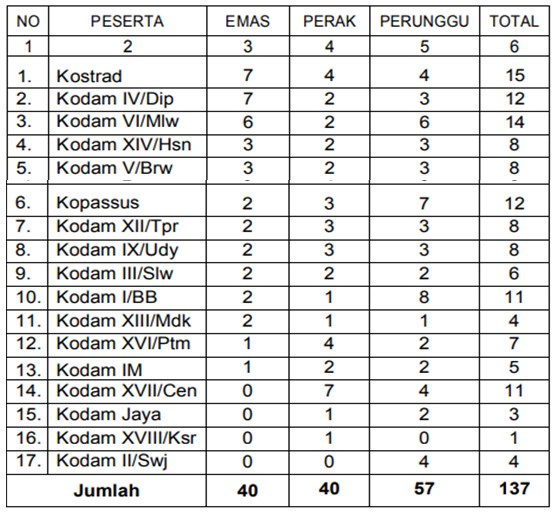 Kelompok PNS Putra dilaksanakan pada Pukul 15.50 s.d. 17.50 dipertandingkan antara Kodam IX/Udy (0) VS Kodam V/Brw (3) dan sebagai Pemenang adalah Kodam V/Brw dengan memperoleh Medali Emas sebagai Juara I, Kodam IX/Udy dengan memperoleh Medali Perak sebagai Juara II dan Kodam I/BB memperoleh Medali Perunggu sebagai Juara III. PNS Putri/Persit Pukul 08.00 s.d. 11.00 dipertandingkan antara Kodam V/Brw (1) Vs Kodam IV/Dip sebagai Pemenang adalah Kodam IV/Dip dengan memperoleh Medali Emas sebagai Juara I, Kodam V/Brw dengan memperoleh Medali Perak sebagai Juara II dan Kopassus dengan memperoleh Medali Perunggu sebagai Juara III