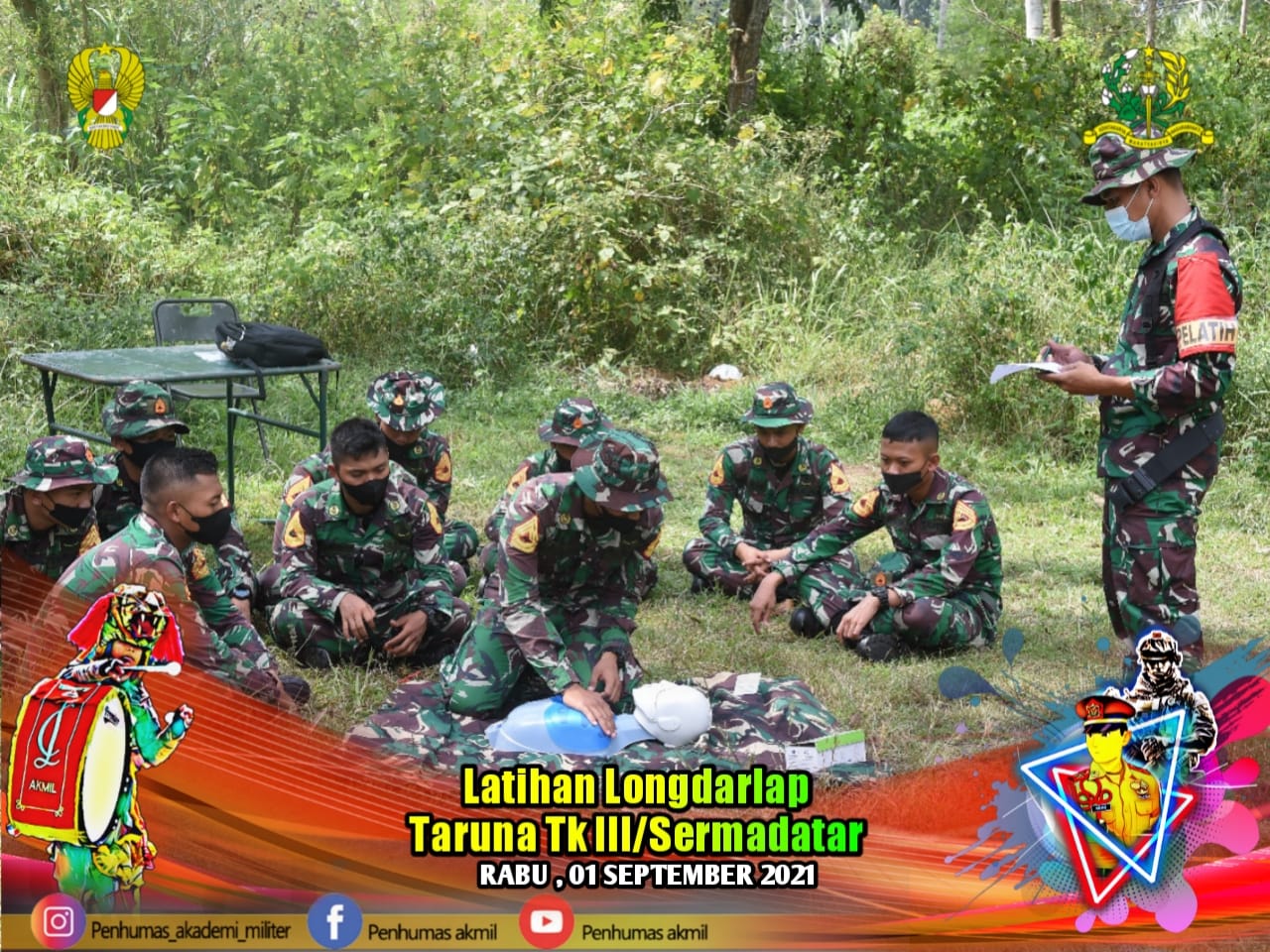 Sejumlah 365 Taruna Tingkat III Akademi Militer melaksanakan Latihan Longdarlap (Pertolongan Darurat Lapangan) yang diselenggarakan di Daerah Latihan Gembung Komplek Akademi Militer. Rabu (01/09/2021).