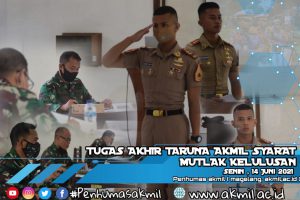 Pelaksanaan Tugas Akhir ini dengan ketua penyelenggara Kolonel Inf Pramungkas Agus. T.S.I.Pem, M.H Kadepsosbah (Kepala Departemen Sosial Bahasa). Rencana kegiatan ini dilaksanakan selama 4 hari mulai hari Senin, tanggal 14 sampai dengan Kamis, 17 Juni 2021. Dari pukul 08.00 sampai dengan 17.00 Wib. Untuk hari ini sejumlah 70 taruna yang melaksanakan Ujian Tugas Akhir (TA).